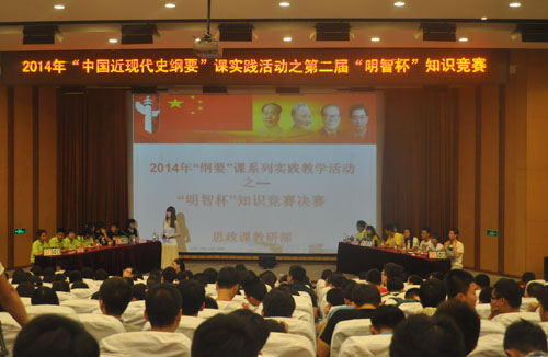 2014年6月4日,由思政课教研部举办的2014年“中国近现代史纲要”课系列实践教学活动之—第二届“明智杯”知识竞赛决赛于图书馆二楼报告厅举行。这次竞赛由思政部“纲要”课程组主办。思政部分教师以及2013级的400多名学生观众观看了此次比赛。