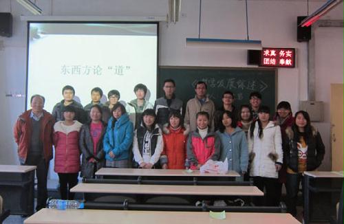 2013年11月30日下午,哲学爱好者之家在5n21教室举行了一场题为“东西方论道”的主题讲座,讲座由思政部刘胜男老师主讲。思政部贾作璋老师、兰俊丽老师和赵元老师亲临现场观摩指导。