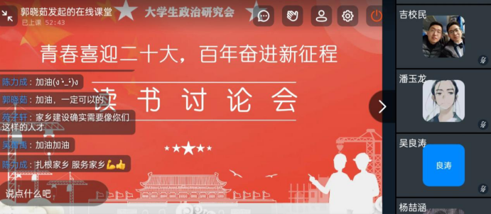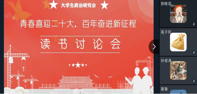 春风吹拂,杨柳依依。4月21日晚,在新葡萄8883官网amg、校团委指导下,大学生政治研究会通过钉钉线上会议的方式组织开展“青春喜迎党的二十大,百年奋进新征程”主题读书讨论会,来自新葡萄官网各个学院的近30位同学参加读书讨论会。