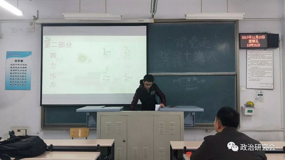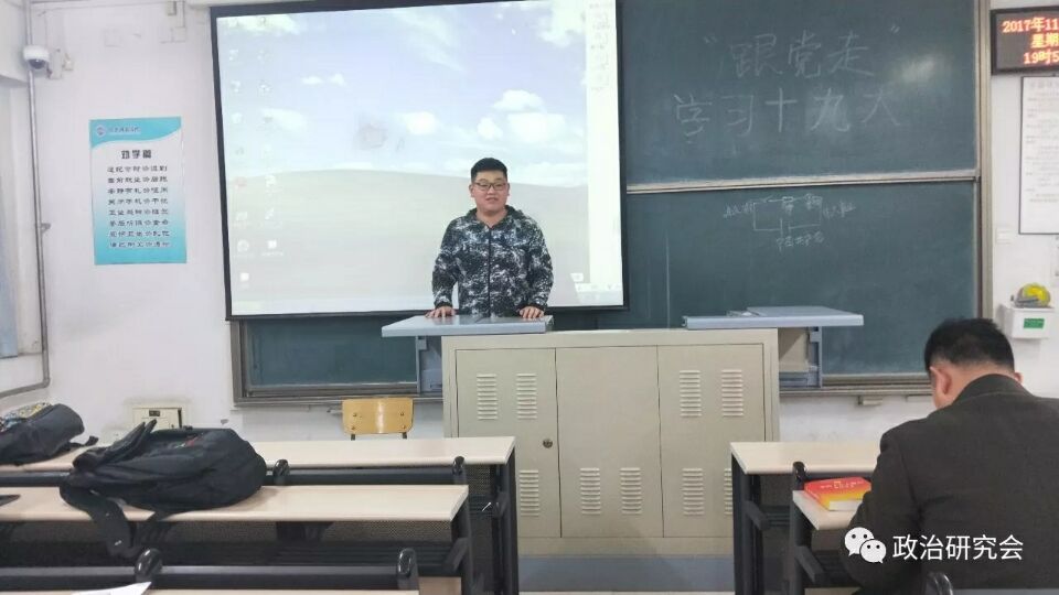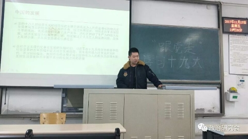 11月17日晚,大学生政治研究会于六号楼508教室开展了“跟党走”学习十九大精神主题活动,思政部田艳天老师、孙红竹老师、高衍超老师到场。